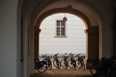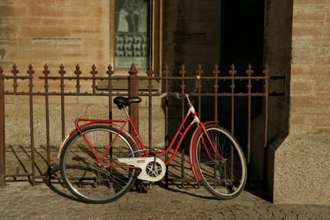 Charming outdoor facade with a bicycle and vibrant pink bougainvillea climbing the wall.