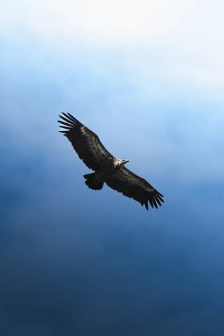 A vulture soaring gracefully against a clear blue sky, showcasing its wingspan and strength.