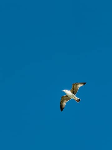 A lone seagull gracefully soars against a vivid blue sky, symbolizing freedom and serenity.