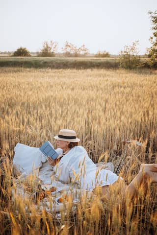 A woman enjoying a book in a peaceful wheat field setting during the day.