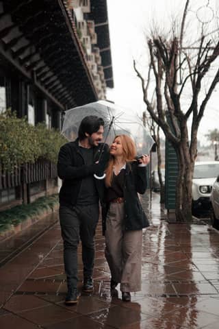 A couple shares an umbrella during a rainy day walk in Gramado, Brazil.