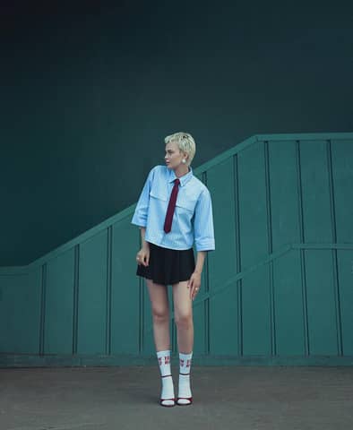 Teenager with blue eyes in a blue suit posing outdoors in Berlin.