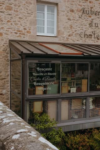 A quaint bookshop facade in Clisson, France, showcasing vintage charm and architectural elegance.