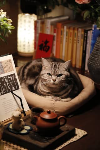 Grey tabby cat lounging in a comfortable bed surrounded by books and decor.