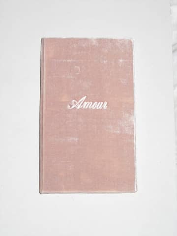 A stylish pink velvet notebook with 'Amour' inscribed elegantly, ideal for personal journaling.