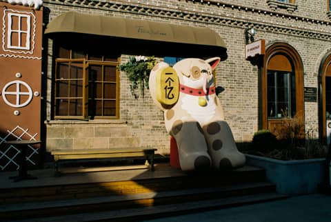 Abstract view of a modern building with pink and gold exterior featuring geometric patterns.