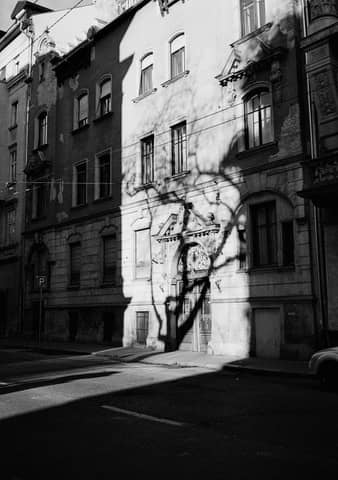 An artistic black and white aerial shot of a person walking on cobblestones, casting a long shadow in Antwerp, Belgium.