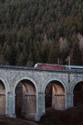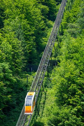 A vibrant orange funicular train ascends through dense green forest on a steep track.