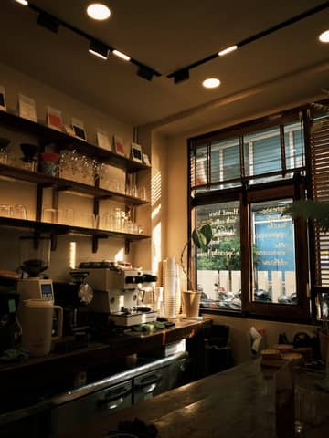 Warm sunlight casts a cozy glow inside an artisan coffee shop with shelves of glassware.