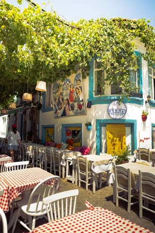 Idyllic outdoor cafe with colorful decor in Bozcaada, Türkiye under lush grapevines.