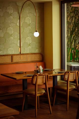 Warm and inviting restaurant interior with modern decor, perfect for dining.