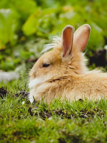 Cute rabbit lying in vibrant green grass in Trentino-Alto Adige, Italy, enjoying nature.