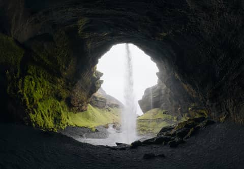 Sunlight streams through a natural rocky archway in a scenic cavern.