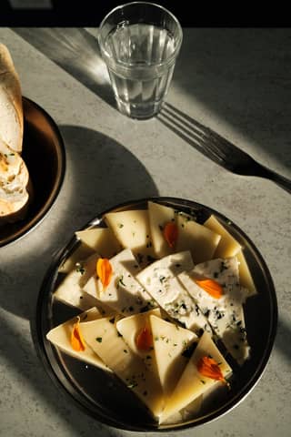 Elegant cheese platter garnished with edible flowers and herbs on a sunlit table.