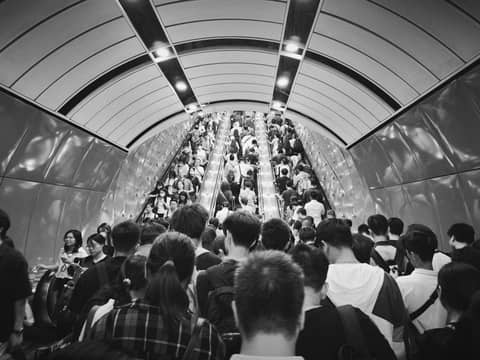 A crowded subway escalator filled with commuters captured in a classic black and white style.