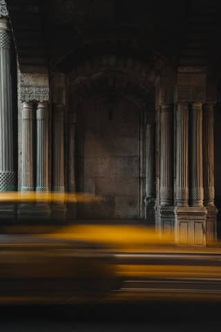 Yellow taxi moving past ancient stone columns, showcasing motion blur effect.