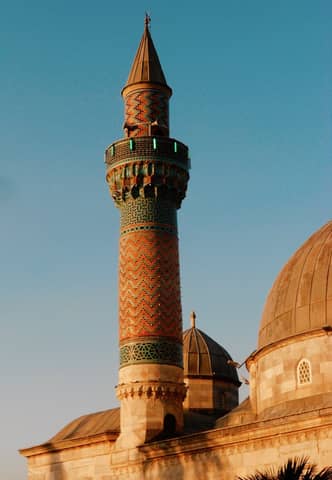A beautifully patterned minaret captured at sunset with a clear blue sky.