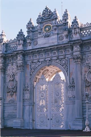 Detailed view of the ornate entrance gate of Dolmabahçe Palace in Istanbul, showcasing intricate architecture.