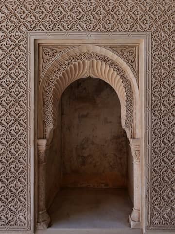 Detailed view of a Moorish arch with ornate carvings in the historic Alhambra Palace, Granada.