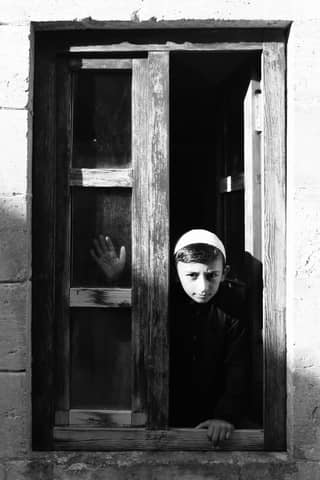 A boy in traditional attire looks out from a window in Şanlıurfa, Türkiye.