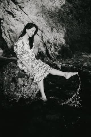 Serene portrait of a woman sitting on rocks by the sea in black and white.