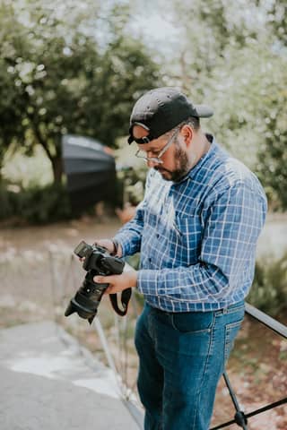 A vintage camera hanging on a striped coat, showcasing classic style.