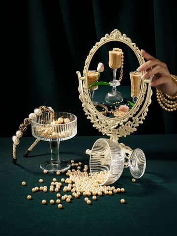 Luxurious still life of pearls, ornate mirror, and champagne for a vintage aesthetic.