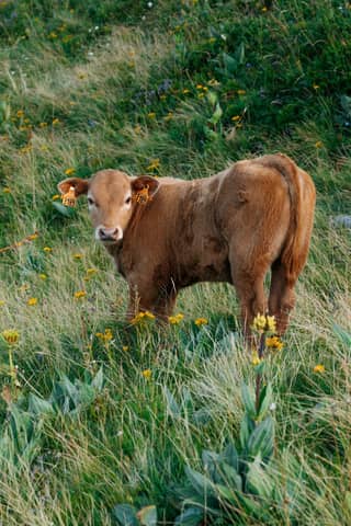 Adorable brown calf standing in a vibrant meadow in the French region of Auvergne-Rhône-Alpes.