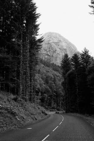 Black and white photo of a winding forest road with a mountain backdrop in Auvergne-Rhône-Alpes, France.