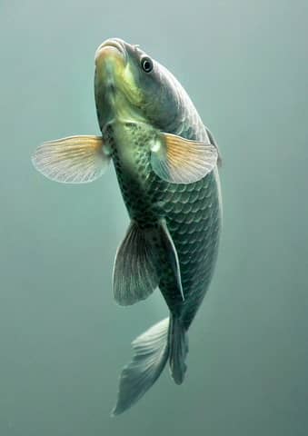 Close-up of a bright koi fish swimming gracefully in a serene pond, showcasing vibrant colors and flowing fins.
