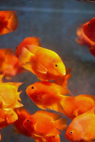 Two vibrant yellow koi fish gracefully swim in a tranquil pond, reflecting sunlight on the water's surface.