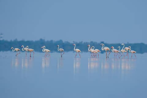 A flock of pink flamingos resting gracefully under the bright sun with vivid plumage.