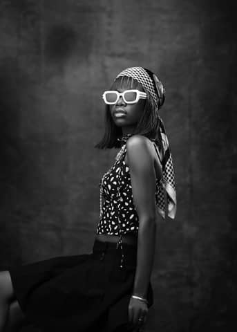 Black and white portrait of a fashionable woman in a fur coat and sunglasses.