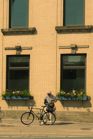 Man with his bike stands by a brick building with flower boxes on a sunny day.