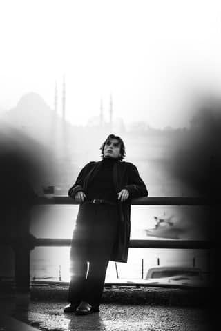 Expressive black and white portrait of a man leaning on a bridge railing in Istanbul at night.