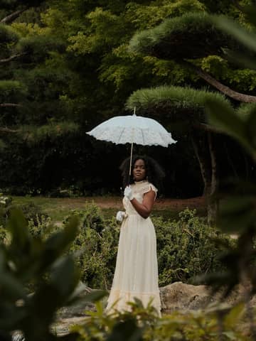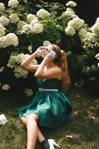 Stylish woman in a green dress and white gloves sitting near hydrangeas in a sunny garden.