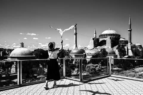 Black and white image of Hagia Sophia with a person releasing a seagull in Istanbul.