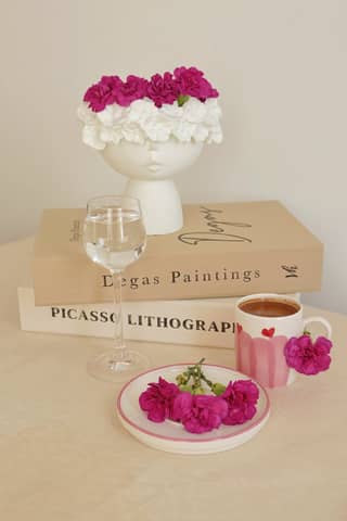 Artistic table with pink flowers, Degas and Picasso books, and coffee cup.