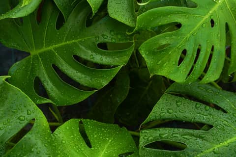 Vibrant green Monstera leaves covered with fresh dew drops, showcasing their natural beauty.