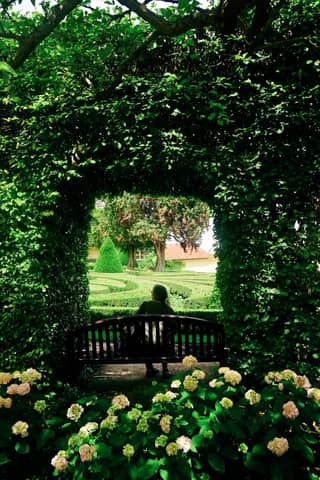Discover tranquility in a lush Prague garden with a scenic archway and peaceful bench.