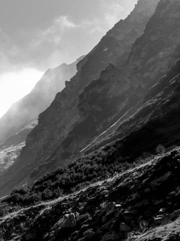 Majestic black and white mountain slopes with misty atmosphere showcasing dramatic natural beauty.