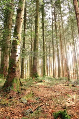 Peaceful forest path surrounded by towering trees and lush greenery, perfect for nature retreats.