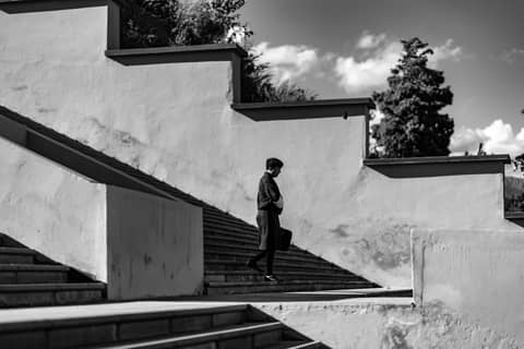 A person walks outdoors reflected in a modern glass facade, creating unique shadows.
