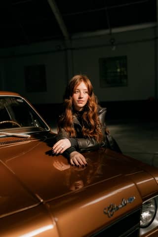 Portrait of a young woman leaning on a vintage car inside a dimly lit garage.