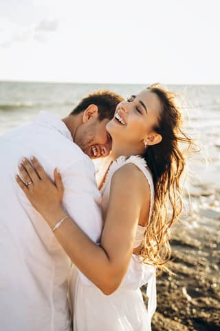 Happy couple enjoying a romantic moment on a sunny beach in Antalya, Türkiye.