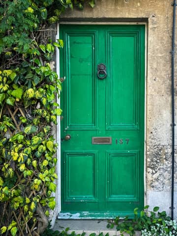 Vibrant green door in Avoncliff, framed by lush ivy on a rustic stone cottage.