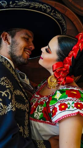A couple shares a romantic moment in colorful traditional Mexican clothing.
