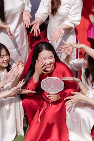 A bride in red surrounded by friends sharing joyous moments on her special day.