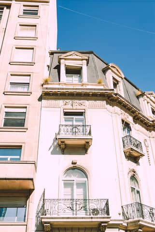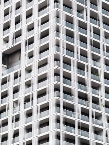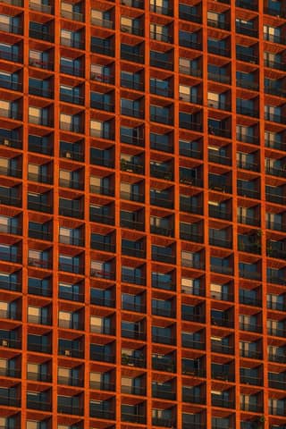 Vivid orange architectural facade showcasing geometric balcony patterns in Mexico City at sunset.