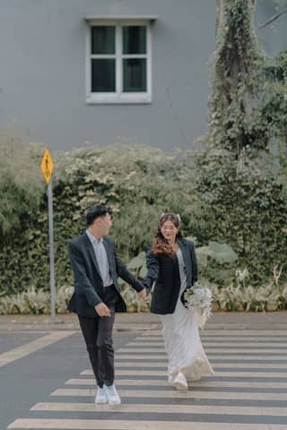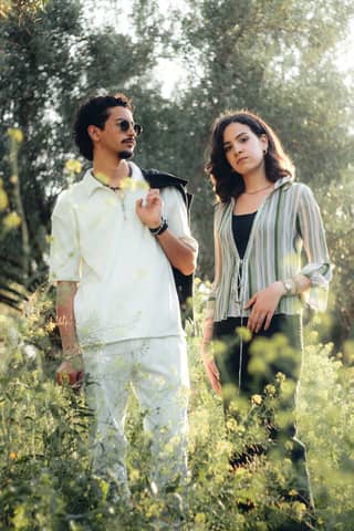 Stylish young couple sitting outdoors on paved ground wearing beige and white casual attire.